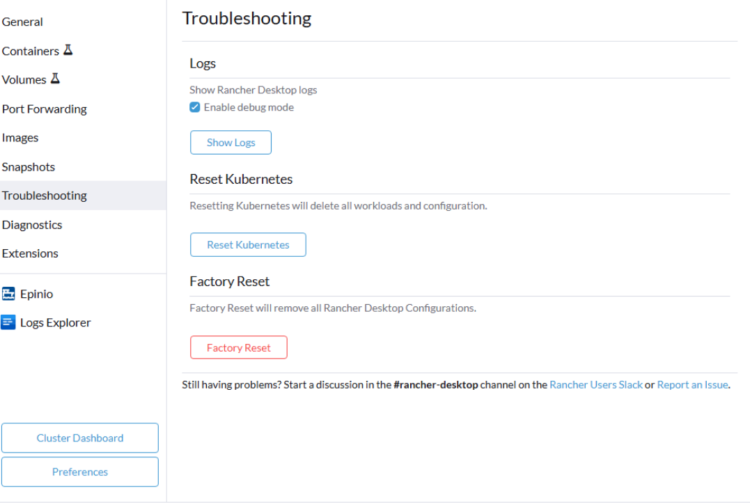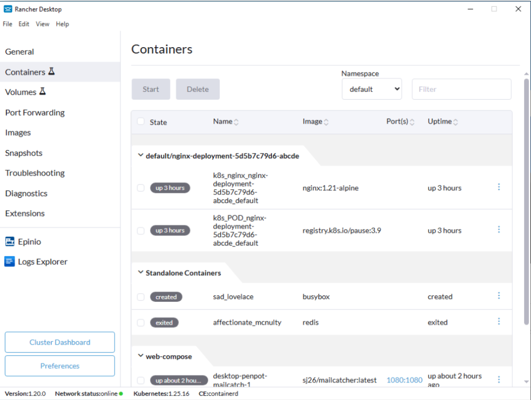 Rancher Desktop 支持在 dockerd(Moby)和 containerd 之间切换。dockerd 支持 Docker API 和 Docker CLI 的使用,而 containerd 为容器提供了命名空间,并支持使用nerdctl。