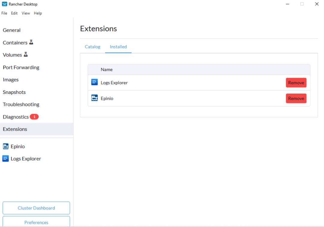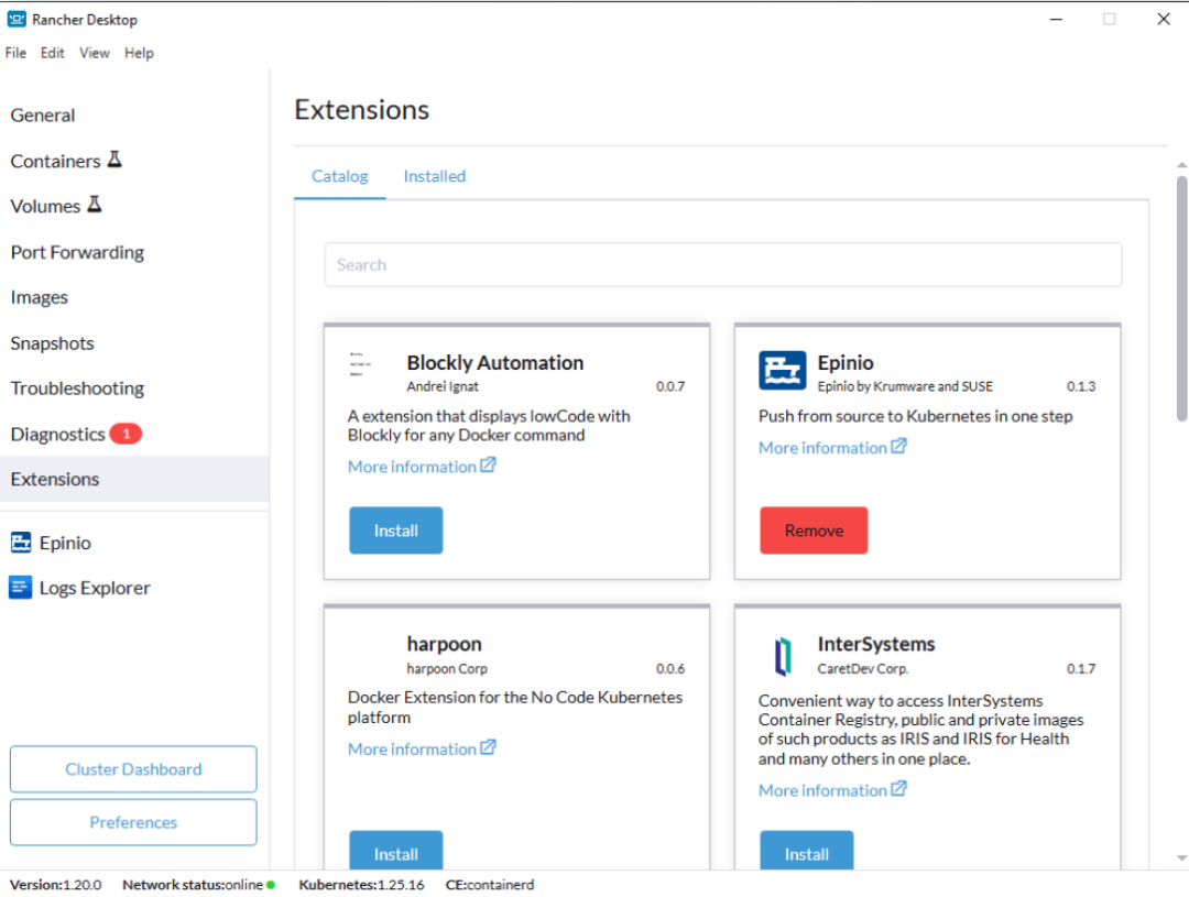 Rancher Desktop支持安装扩展来增加功能。用户可以从扩展选项卡中选择经过测试和验证的扩展进行安装。