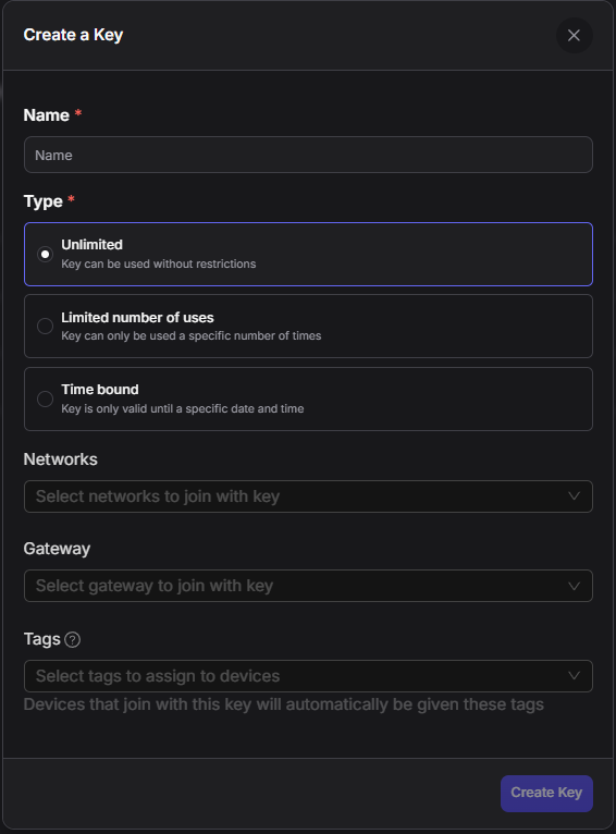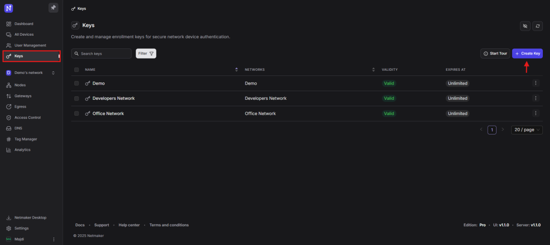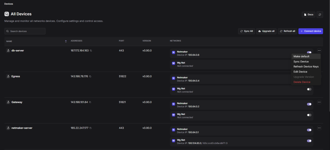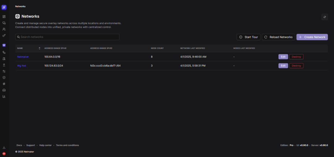Netmaker 支持一键创建多种类型的 WireGuard 网络,包括远程访问网关、Mesh VPN(全互联网络)、站点到站点 VPN 等。用户无需手动配置复杂的网络参数,只需简单操作即可完成网络部署。