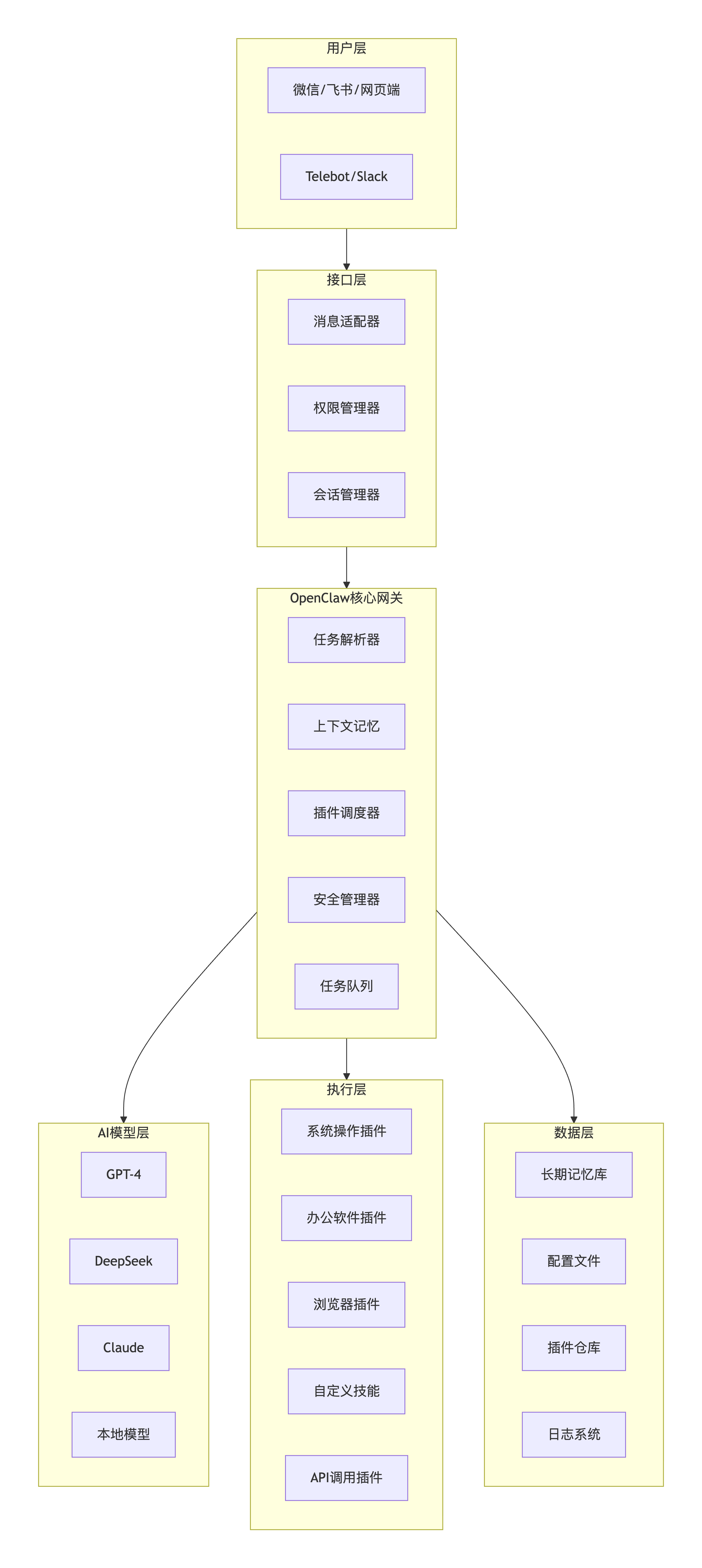 OpenClaw的架构设计充分体现了“网关”与“执行器”的核心理念。下图用五层结构清晰地展示了各模块之间的关系: