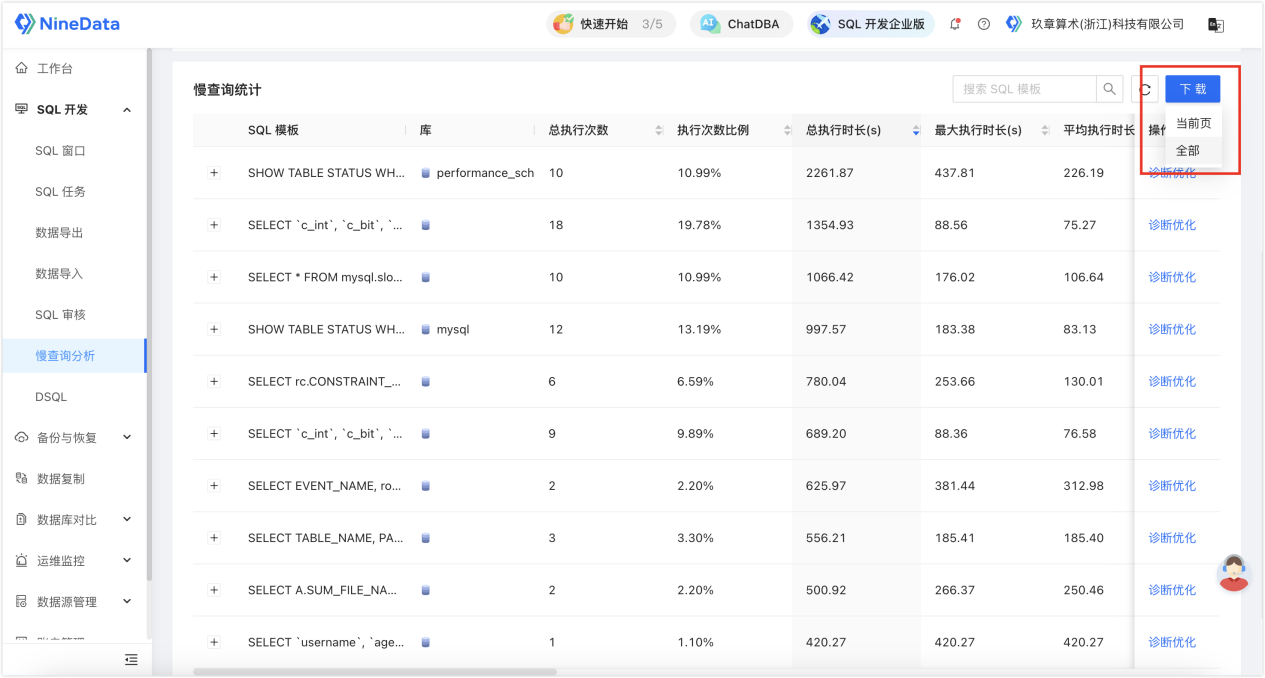 NineData慢查询报表下载:这个功能在我需要将优化需求提交给开发人员的时候比较实用,在数据源慢查询详情页中可将目标时间段的相关慢 SQL 整合到一个 PDF 文档中,其中包含了相关整改详情信息,以便开发人员对照优化。