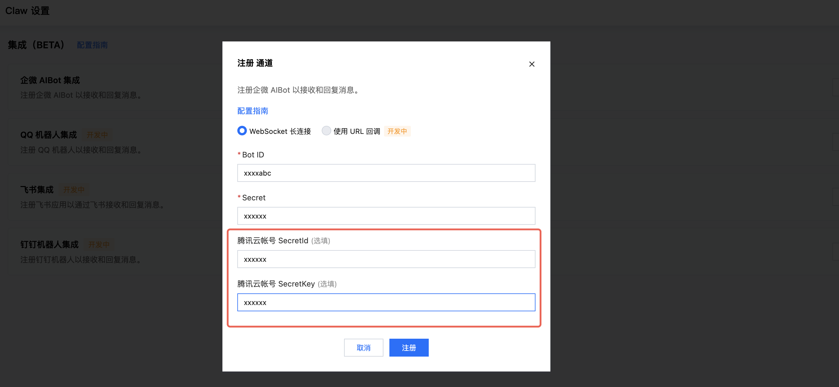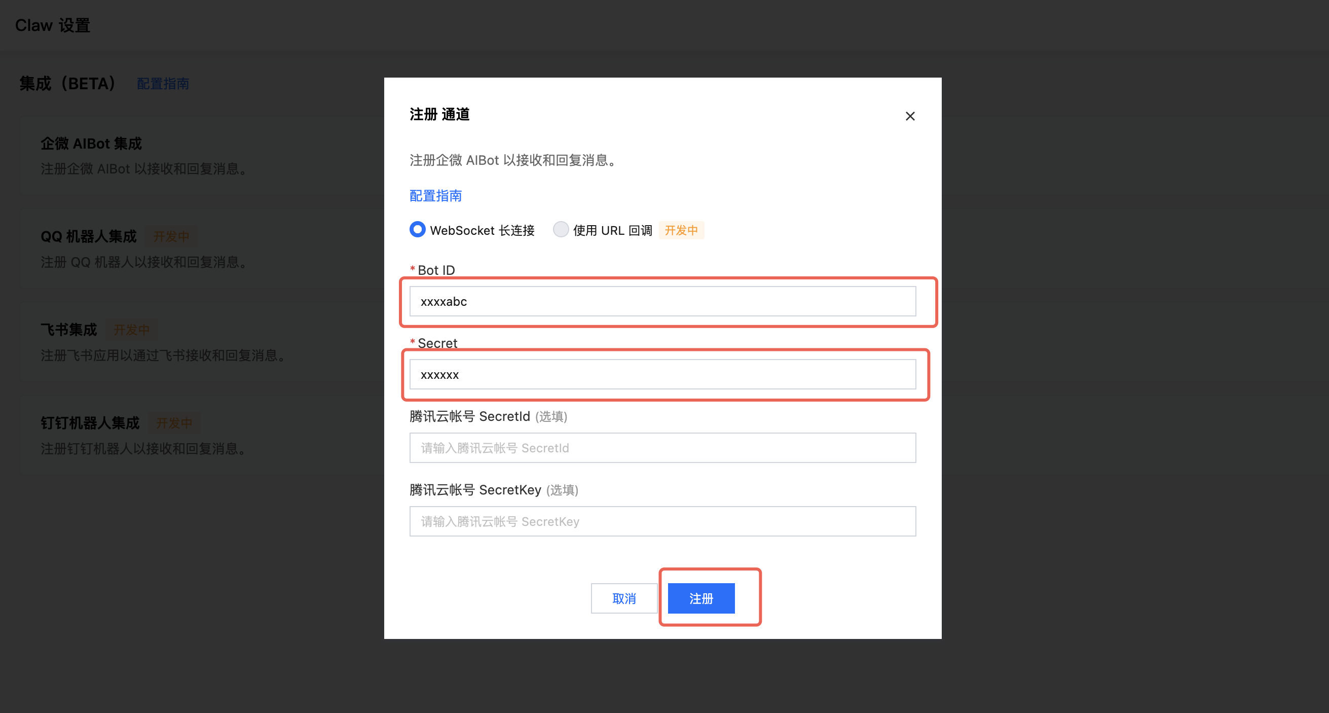 在弹出的「注册企微 AIBot 通道」窗口中: