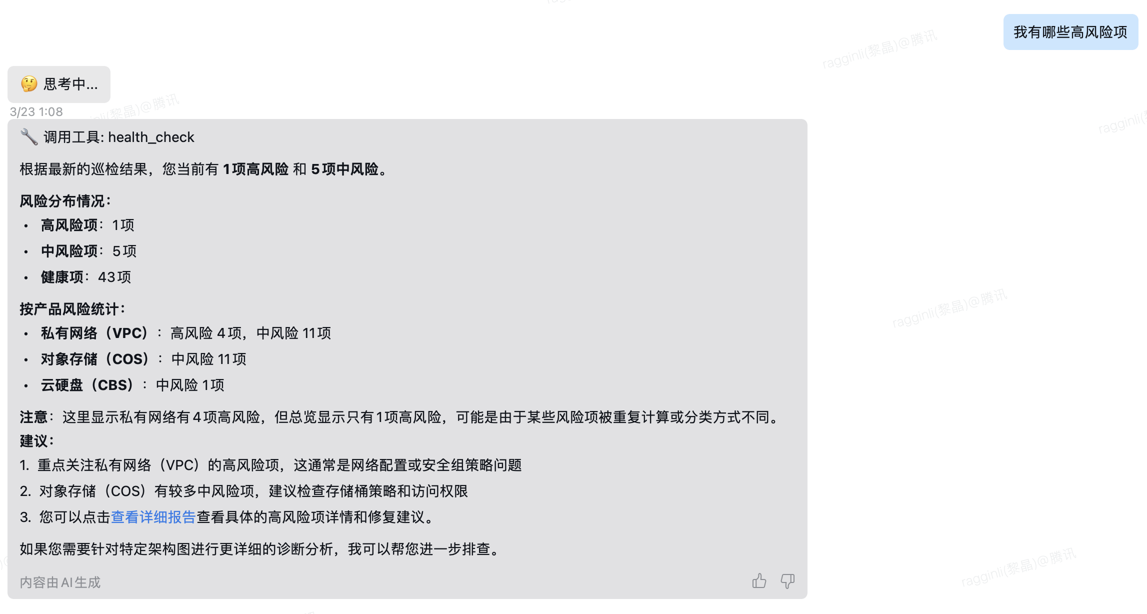 “我有哪些高风险项?” | 列出当前高风险和中风险项的详细信息 |