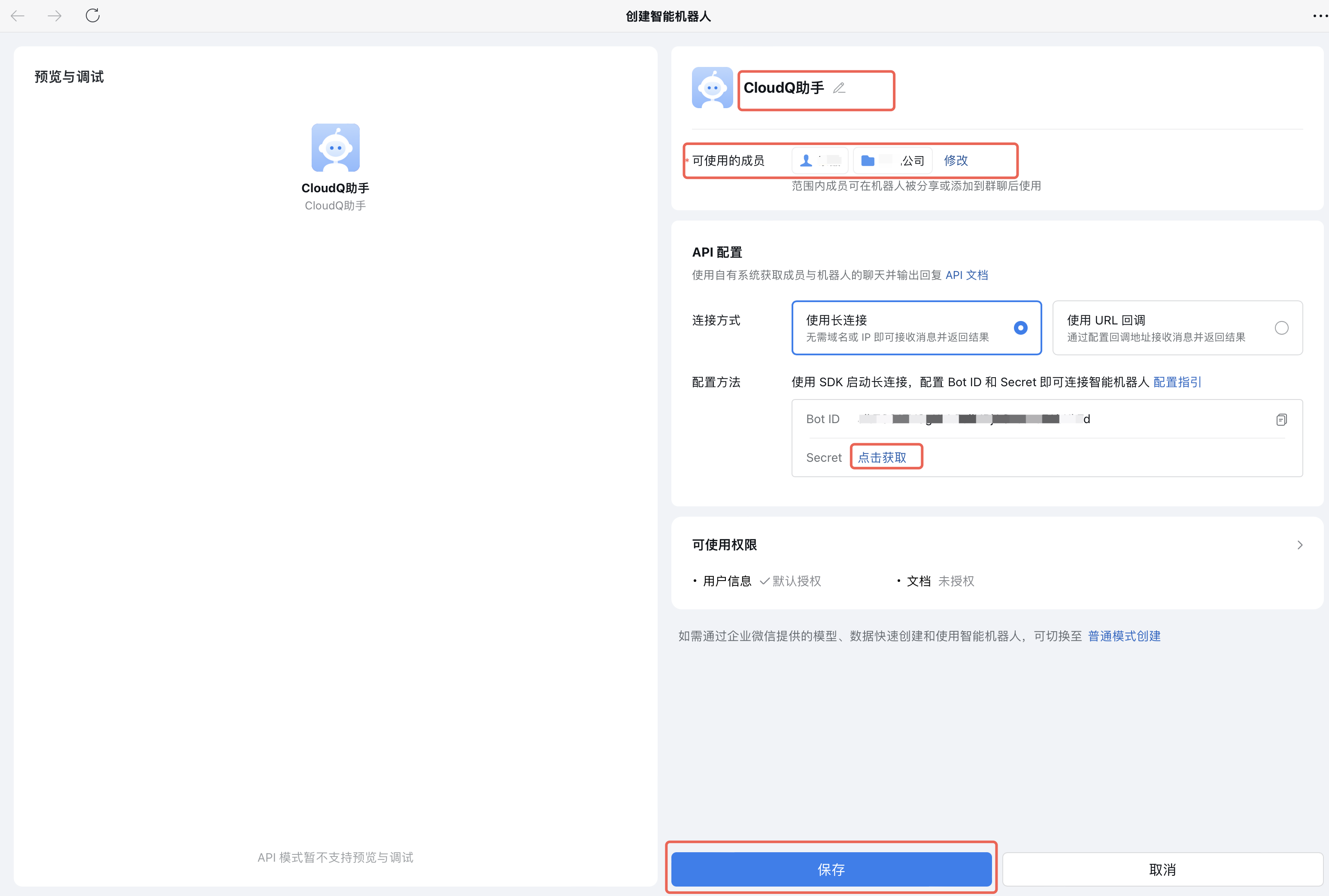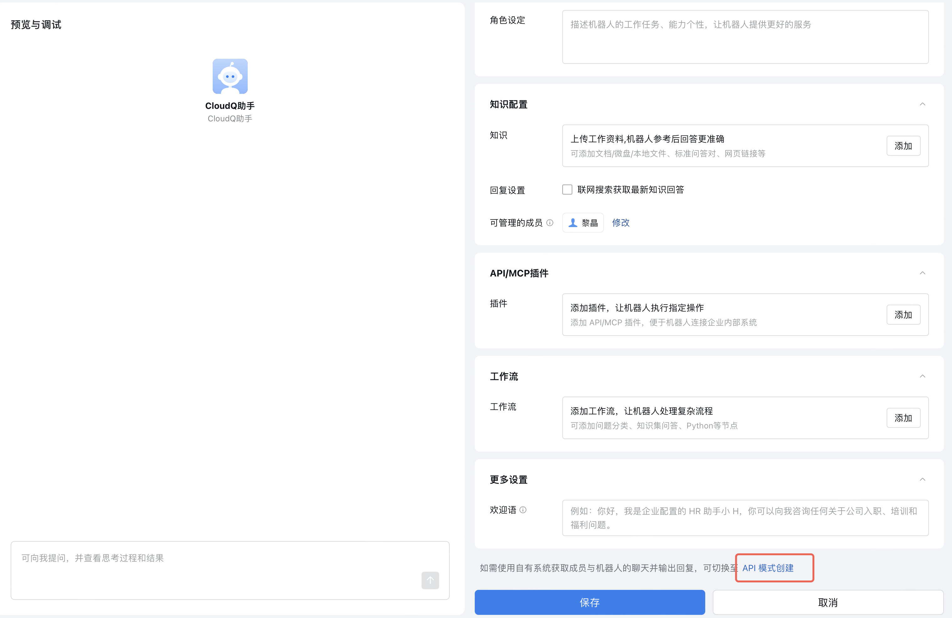 💡 进入后先填写机器人名称(如“CloudQ 助手”)、可见范围等基本信息。 |