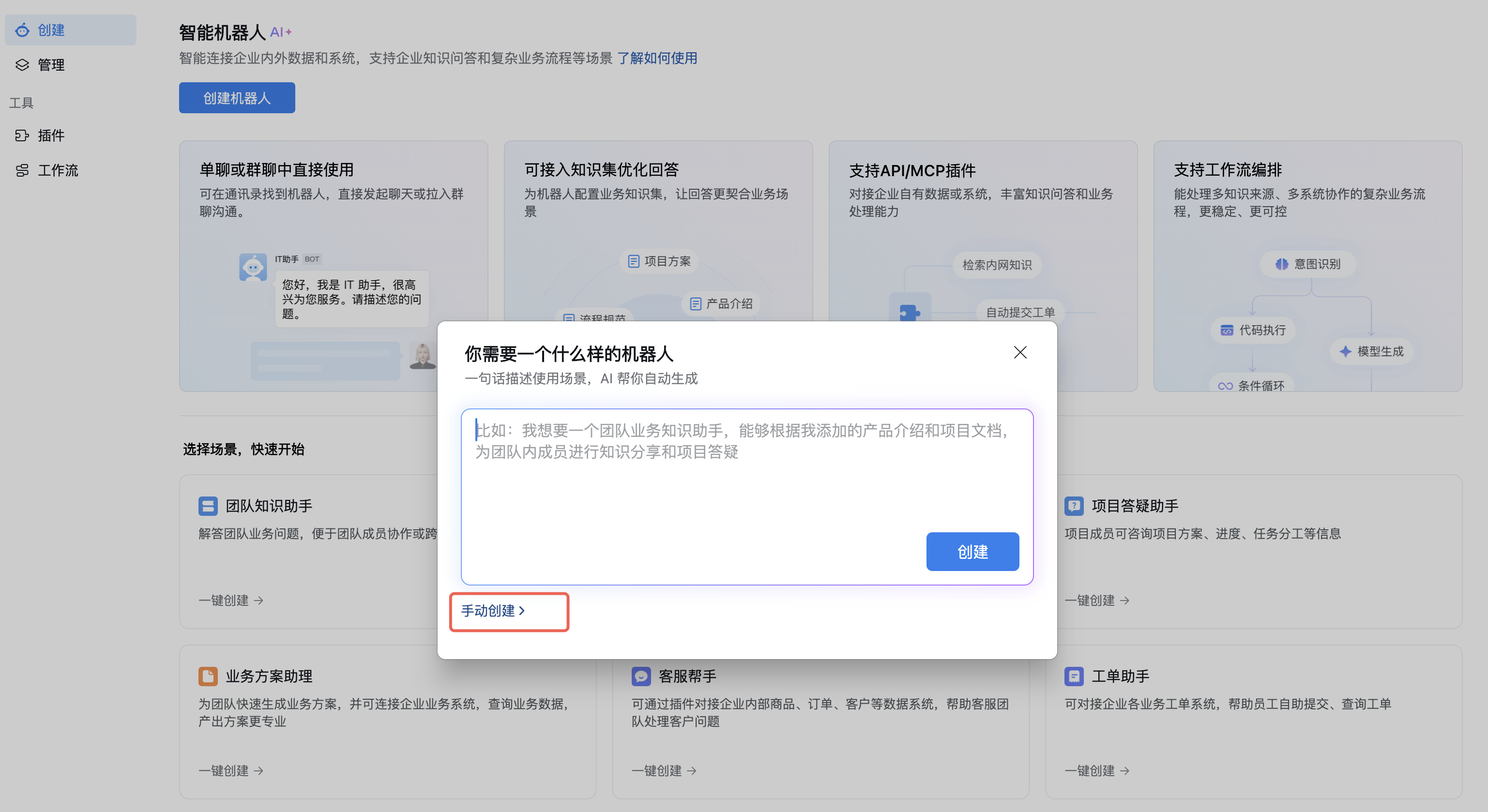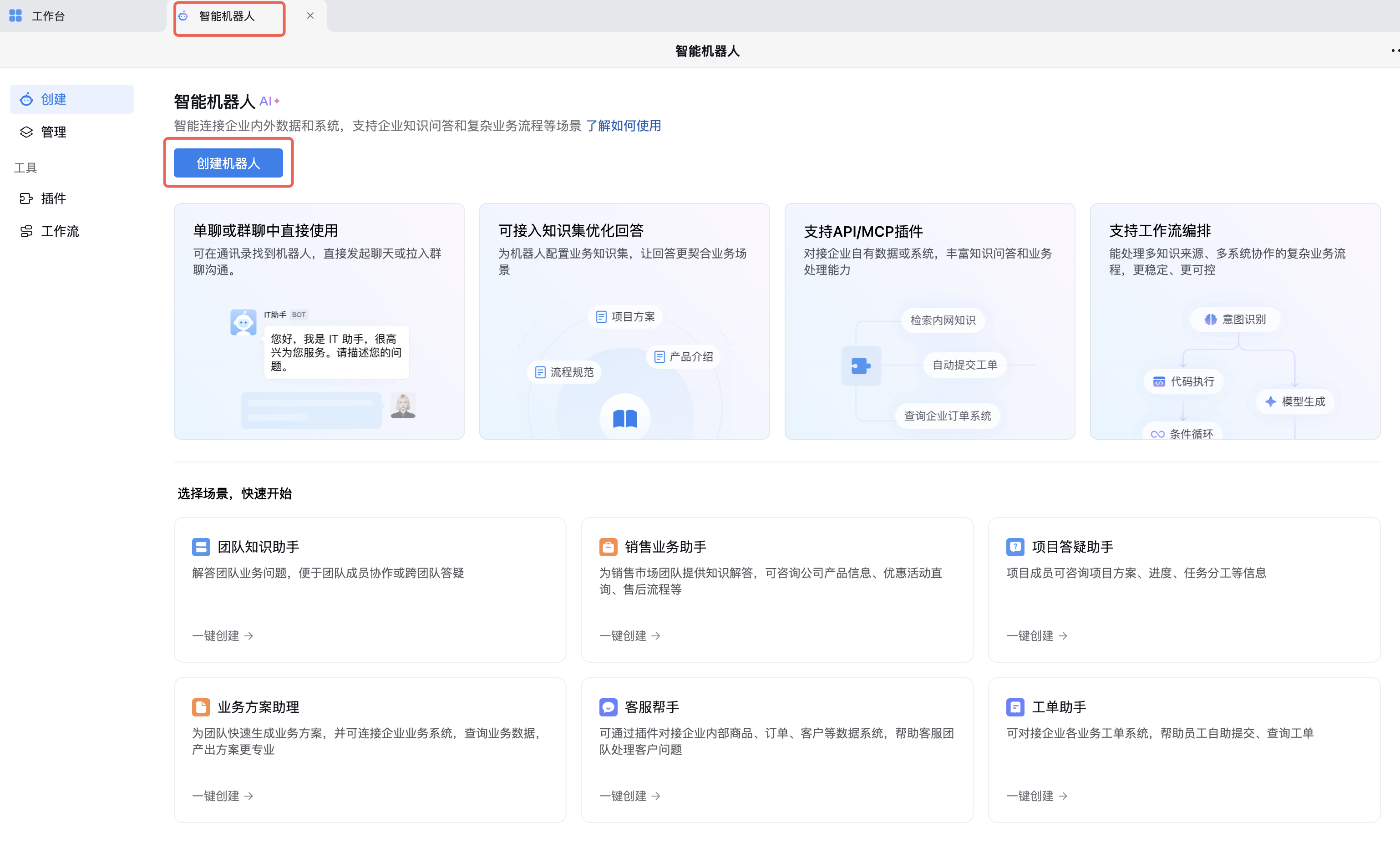 普通成员 | 打开企业微信客户端 →「工作台」→「智能机器人」→「创建机器人」 |