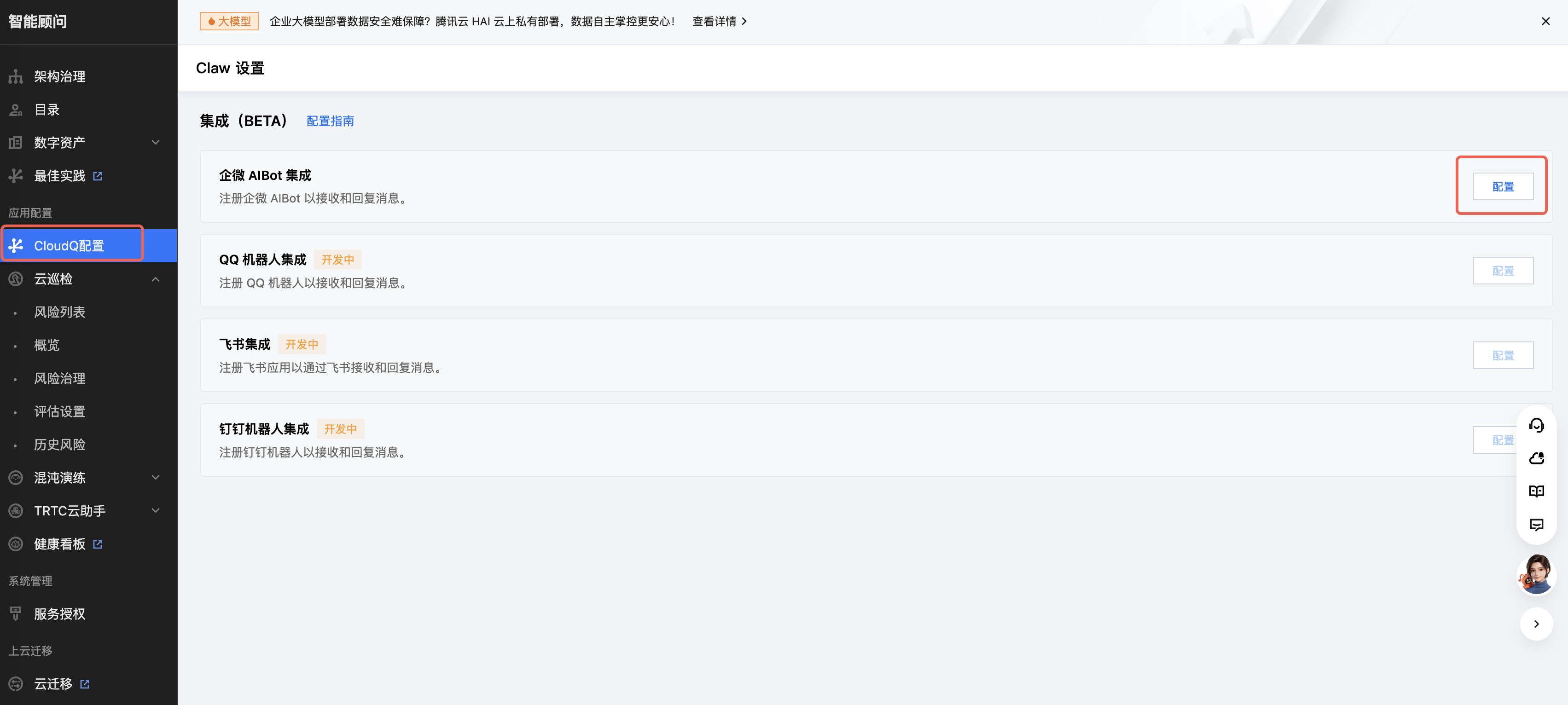 在左侧导航栏中点击「CloudQ配置」,进入「Claw 设置」页面。