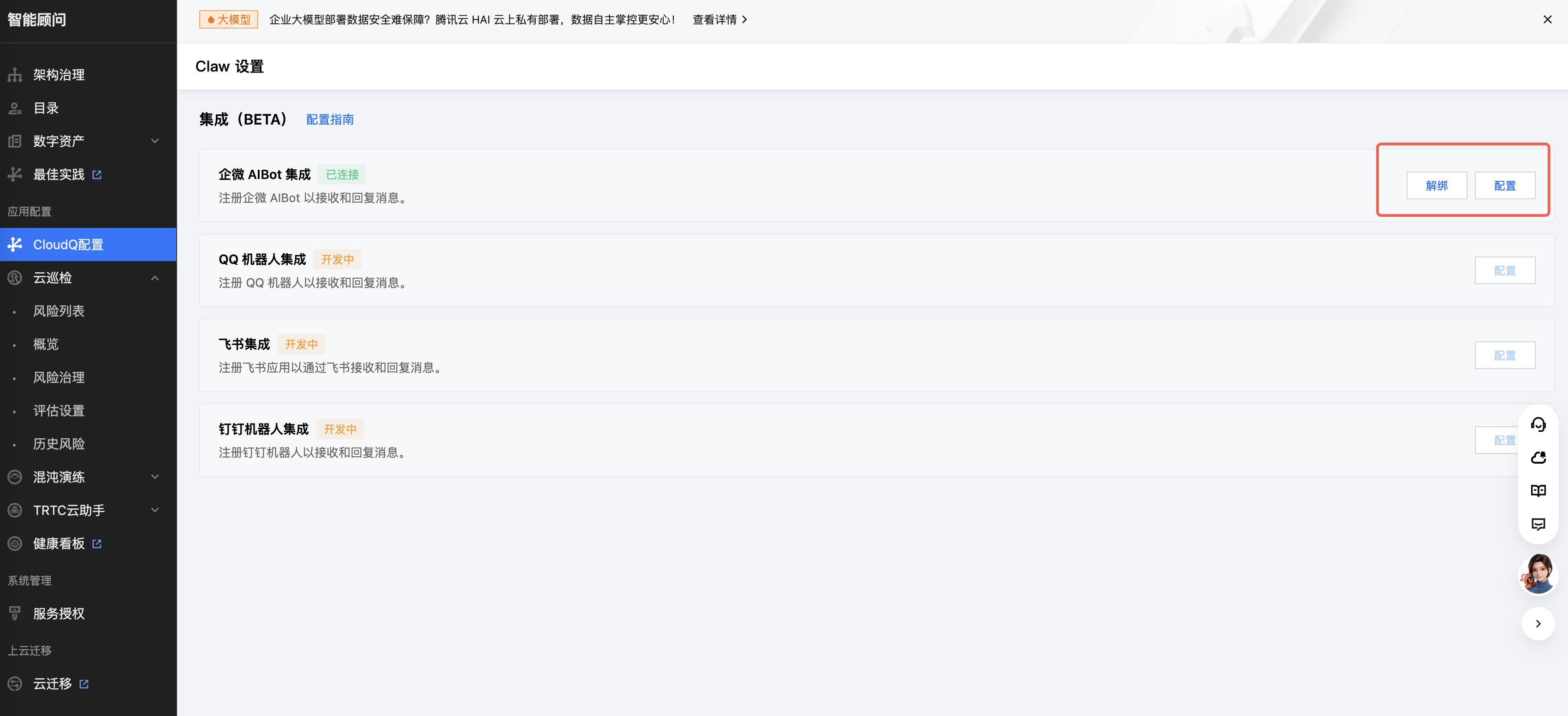 在「集成(BETA)」区域,找到「企微 AIBot 集成」,点击右侧的「配置」按钮。