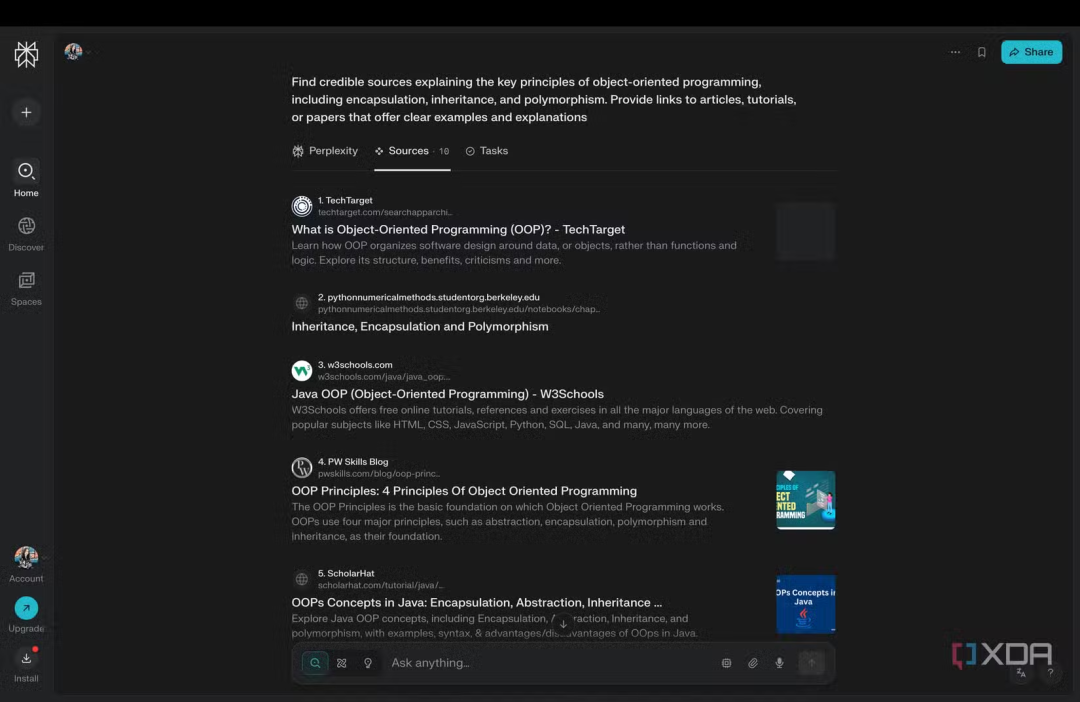 虽然 Perplexity 基本上回答了作者的问题,但还是立即从“答案”选项卡切换到“来源”选项卡,该选项卡列出了 AI 用来查找该答案的所有来源。现在,只需将它找到的来源导入到 NotebookLM 笔记本中即可。