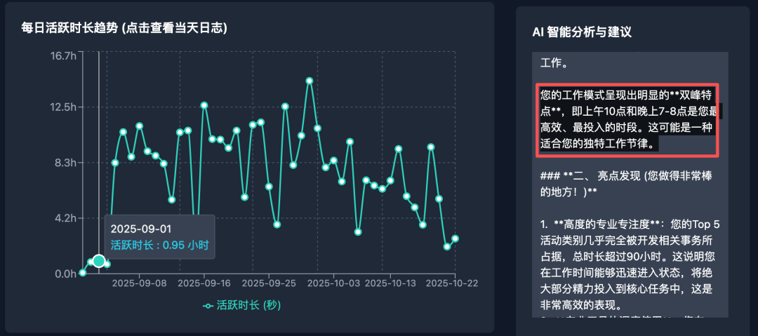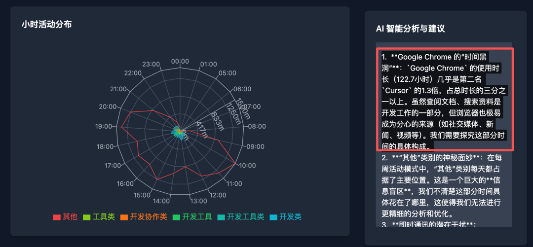 我给自己做了个时间管理的Agent,基于我持续了一个多月的采集数据(这种自动采集方式,让我可以忘记采集这件事,专心工作),从分析结果上看,原来上午10点、晚上7–8点是我的高效时段,WeChat对我的干扰比较大,需要改进WeChat的使用方式,不能频繁打断我的“心流状态”,Agent给出了每天固定3–4次集中回复的建议。