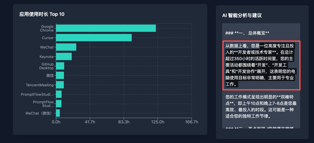 一款专为希望提升个人生产力的用户设计的智能时间分析工具,通过深度解析您的电脑使用行为,帮助您发现“时间黑洞”,并借助 AI 助手的交互式对话,提供个性化、可行动的优化建议。