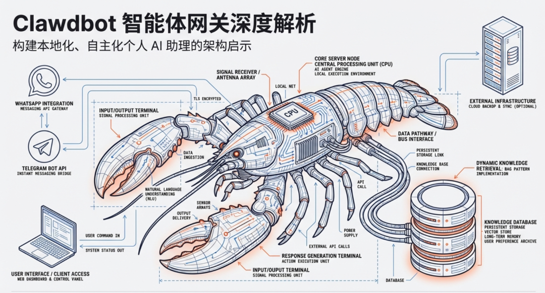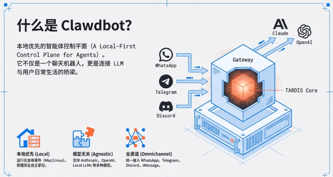 Clawdbot 并非另一个被困在 Web 端的小丑,它的本质是一个全时在线的数字「Gateway(网关)」。你可以把它想象成 Claude 的「外骨骼」,它接管了你的 WhatsApp、Telegram 甚至 iMessage,让 AI 摆脱了标签页的囚禁,直接潜入你的物理设备与通讯软件里。