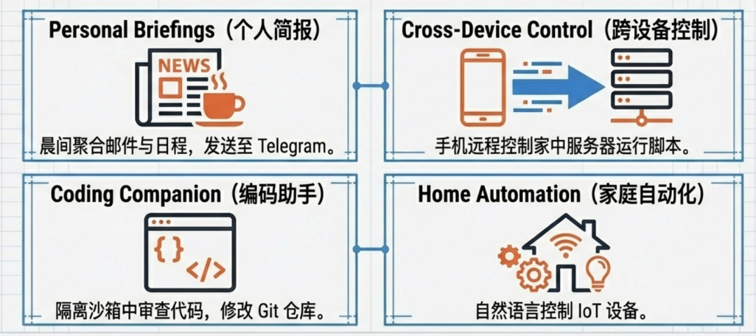 - 节点化执行(Nodes): 你的 Mac、iPhone 甚至远程服务器都变成了网关的「器官」。AI 不再被关在网页里,它可以通过