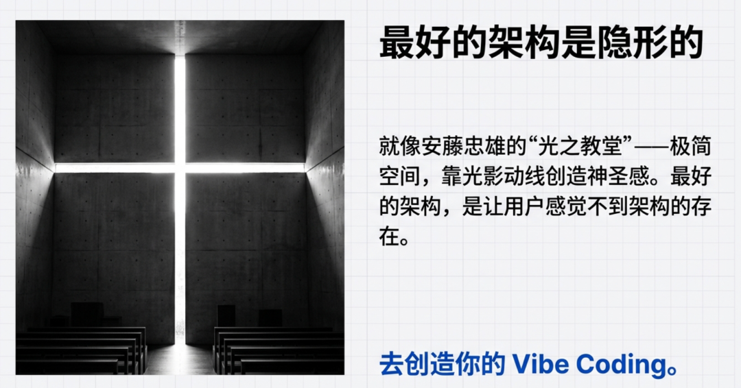 就像安藤忠雄的“光之教堂” —— 极简空间,靠光影动线创造神圣感。