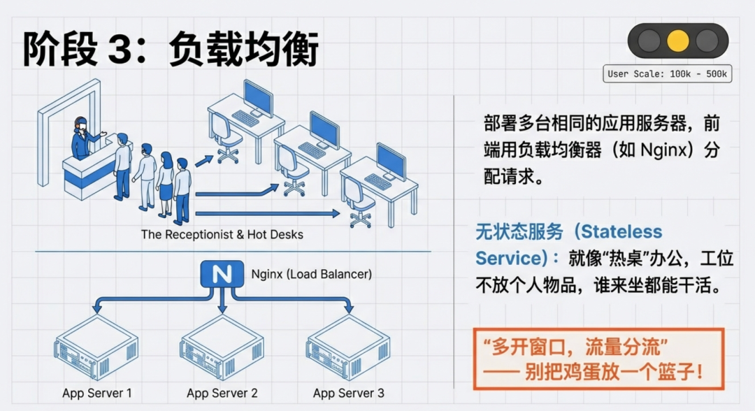 部署多台相同的应用服务器,前端用负载均衡器(如Nginx)分配用户请求,避免单点过载。