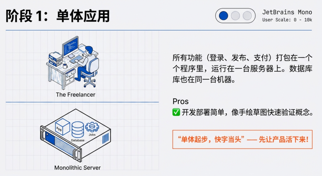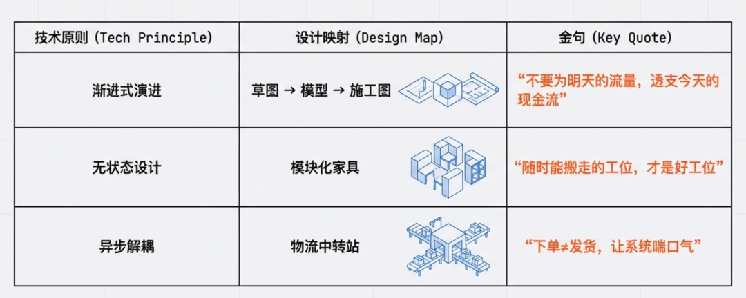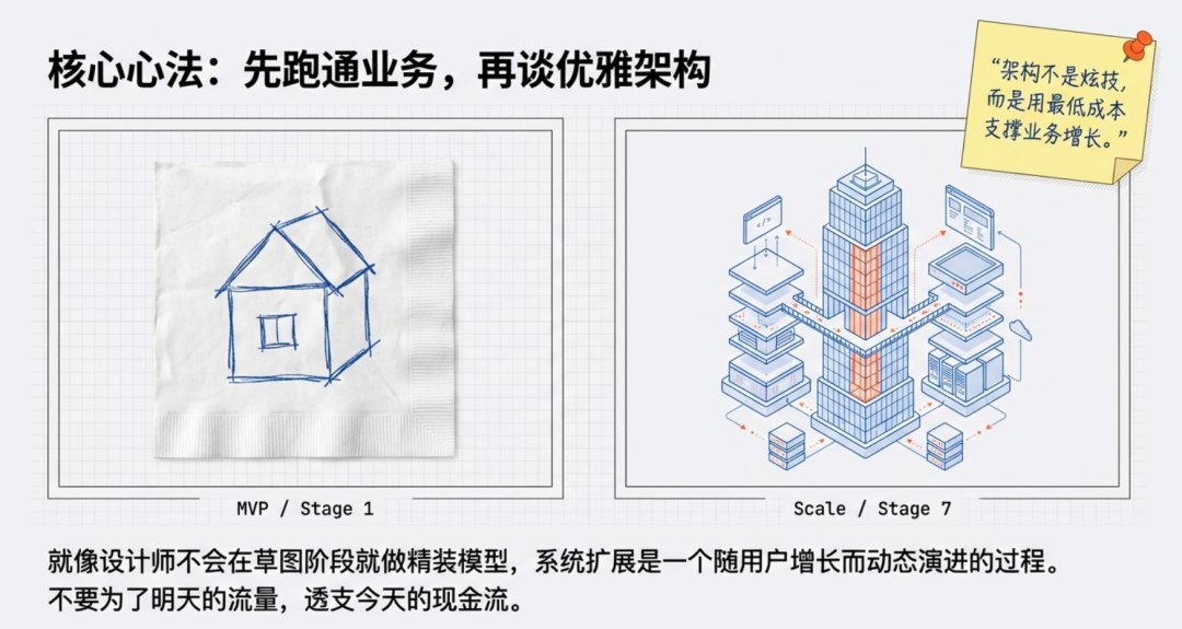💡 核心心法:先跑通业务,再谈优雅架构。就像设计师不会为草图阶段做精装模型 —— 系统扩展是随用户增长的动态演进过程。