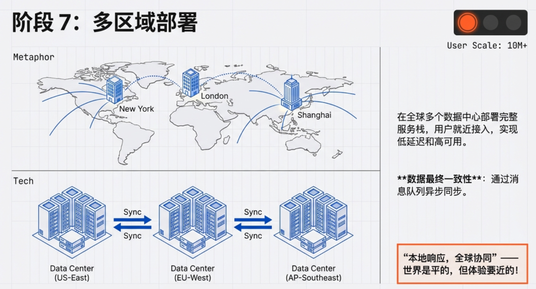 在全球多个数据中心(如美东、欧洲、亚太)部署完整服务栈,用户就近接入,实现低延迟和高可用。