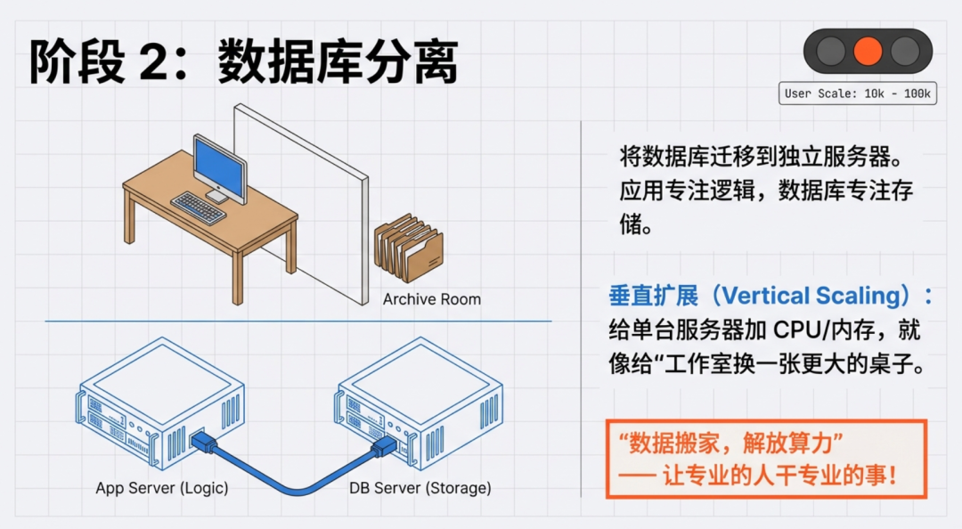 将数据库迁移到独立服务器。应用服务器专注处理业务逻辑,数据库专注存储和查询。