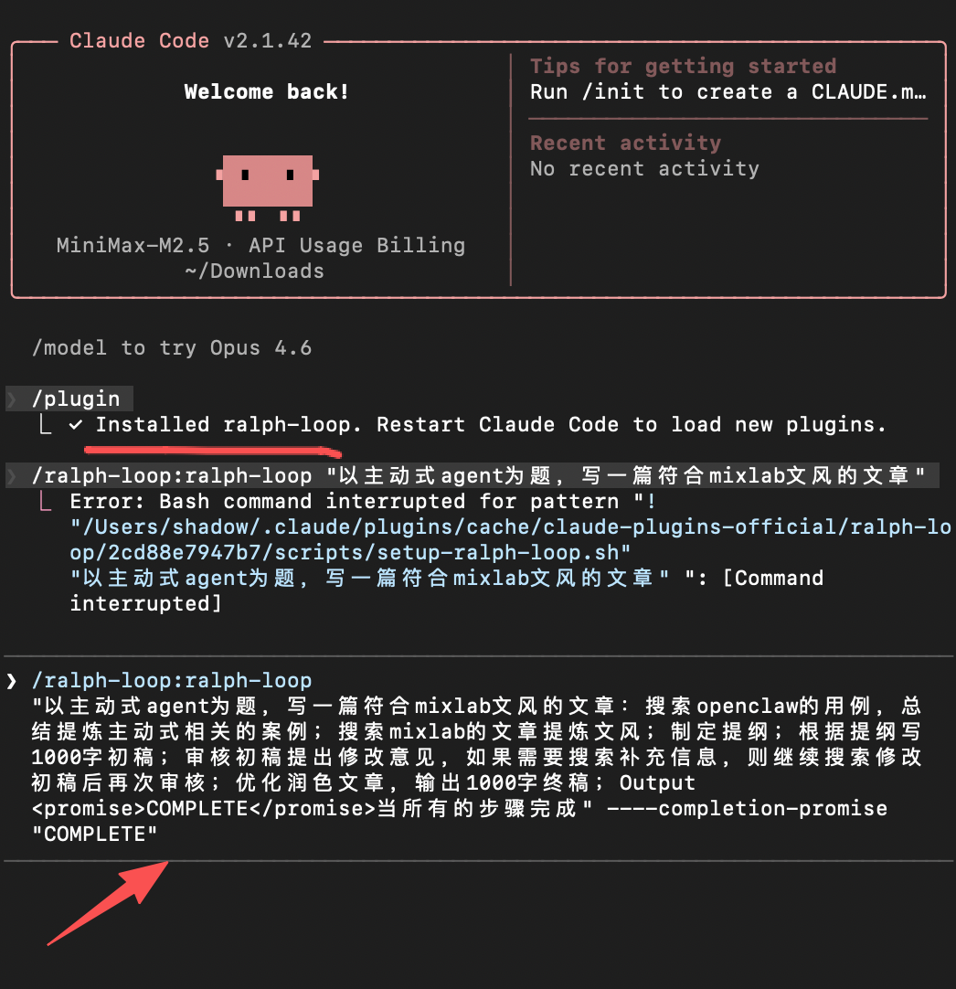 claude 启动后,输入 /plugin,找到 ralph-loop 安装。/ralph-loop xxxxx(xxxxx 为你的任务描述)。