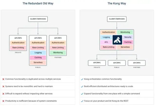 从下图可以看到Kong解决的问题。专注于全局的Api管理策略,全局流量监控、日志记录、全局限流、黑白名单控制、接入请求到业务系统的负载均衡等。