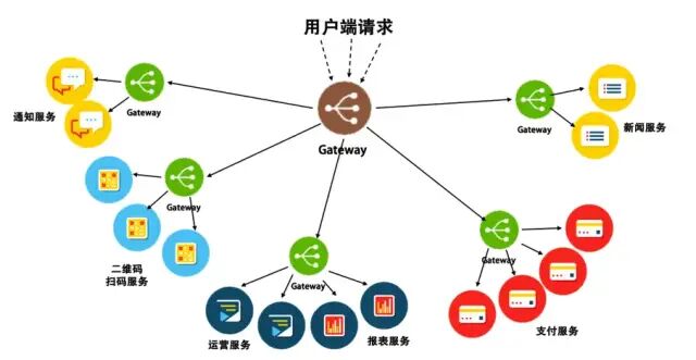 下面图介绍了网关(Gateway)作用,可知 Gateway 方式下的架构,可以细到为每一个服务的实例配置一个自己的 Gateway,也可以粗到为一组服务配置一个,甚至可以粗到为整个架构配置一个接入的 Gateway。于是,整个系统架构的复杂度就会变得简单可控起来。