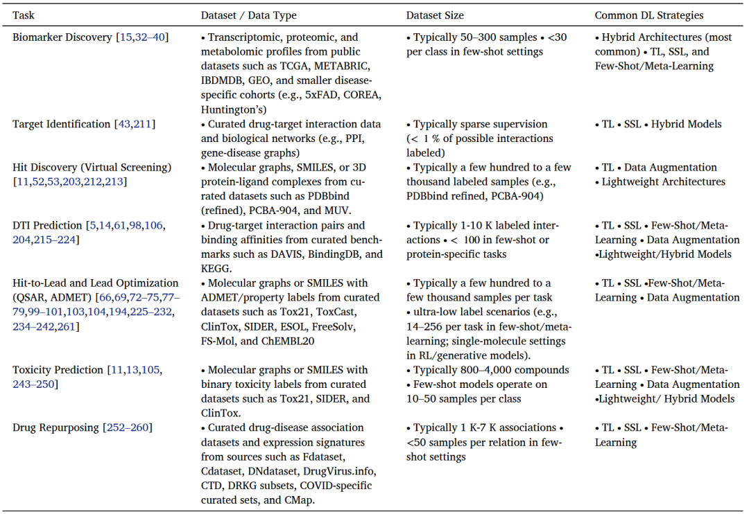 常用的小数据DL策略包括迁移学习、自监督学习、小样本学习与元学习、数据增强、混合与轻量化架构。表3概述了小数据药物发现中常用DL策略的优势与局限。