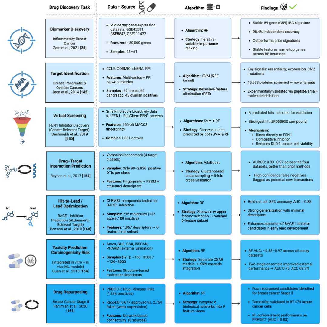 传统ML方法由于样本复杂度较低、假设空间更受约束,特别适合小数据场景。这类模型能够从稀疏、含噪或类别不平衡的数据集中学习,而这些情况在早期药物发现、罕见疾病建模以及企业专有数据中十分常见。其性能在很大程度上依赖特征工程质量,但其具有较高的透明度,且通常比深度神经网络更易验证和调试。传统ML模型在计算上也更高效,使其适用于资源有限的实验室或需要快速迭代的场景。这些特性使其成为标注数据有限且需要快速反馈的早期项目的理想选择。同时,围绕传统ML的成熟工具生态(如scikit-learn)以及集成的化学信息学平台,进一步提升了其在真实药物发现应用中的实用性。