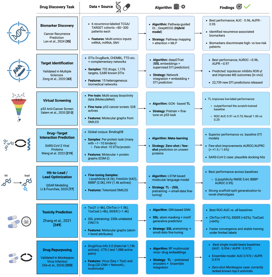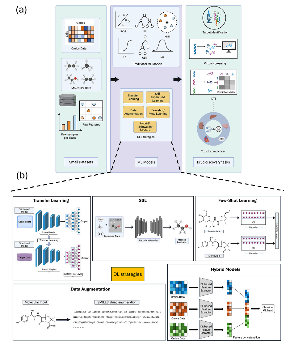 机器学习(ML)和深度学习(DL)已在药物发现流程的关键阶段取得进展。支持向量机(SVM)、随机森林(RF)、梯度提升树(GBT)、朴素贝叶斯(NB)和逻辑回归(LR)等传统ML算法,长期以来被用于多种药物发现任务,从组学和化学数据中提取有意义的特征。在小数据情境下,这类模型因其稳健性、可解释性和计算效率而具有吸引力。然而,ML方法依赖人工特征工程,且缺乏端到端学习能力,限制了对复杂非线性模式的捕捉以及在多样化生物医学场景中的泛化能力。相比之下,DL模型能够从原始输入数据中自动学习复杂表征,实现无需人工特征工程的端到端建模。在数据充足的药物发现应用中,DL模型已取得显著成果,显示出在高质量大数据条件下的潜力。这些成功在很大程度上依赖于大规模、高质量标注数据,而这一条件在生物医学研究中往往难以满足。