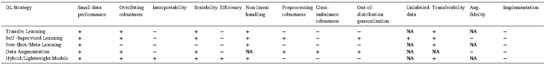 图3则提供了一个高层次的实用决策流程,用于判断何时传统ML已足够部署,以及当泛化能力仍受限时推荐适用于常见数据挑战的DL策略。该流程针对常见数据挑战进行设计,例如高维性、标签稀缺、类别不平衡、域偏移、异构多模态输入。