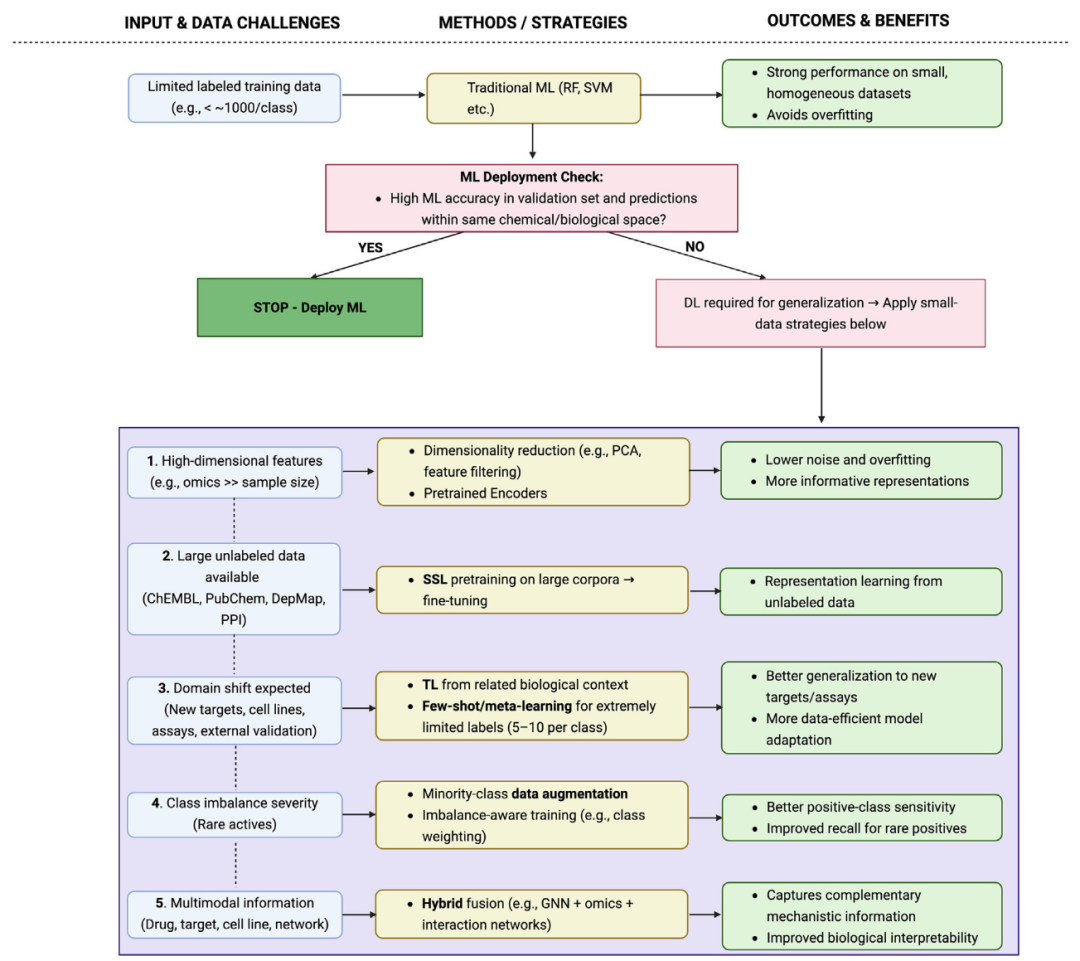小数据集为ML和DL模型带来显著挑战,尤其是在分子描述符或组学数据这类高维场景中。过拟合是主要问题,当特征数量远超样本数量时,模型容易学习到数据集特有的伪相关结构,而非可泛化的规律。此外,类别不平衡、域偏移和数据异质性也会进一步增加训练难度,并限制模型在不同任务或队列间的迁移能力。这些问题在罕见疾病研究和早期筛选中尤为关键,因为实验验证成本高昂。