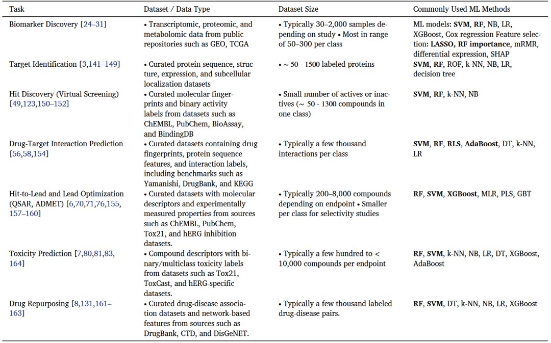 表2总结了代表性的药物发现任务及其常用的传统ML模型,并列出了典型数据类型和样本规模。