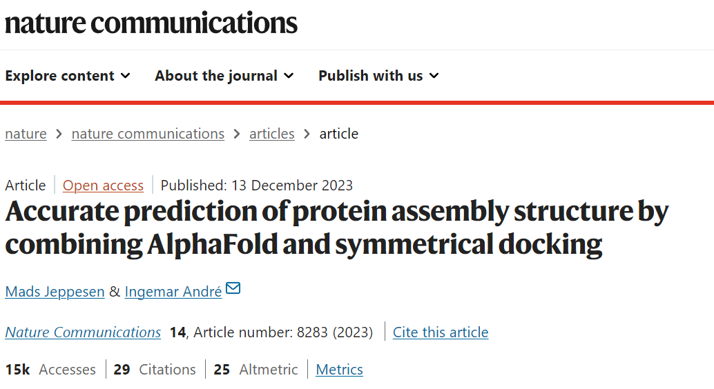 2023年12月16日,瑞典隆德大学的Ingemar André团队在Nature Communications上发表了一篇题为《Accurate prediction of protein assembly structure by combining AlphaFold and symmetrical docking》的论文。这篇文章介绍了一种结合AlphaFold预测与对称分子对接的新方法EvoDOCK,用于高精度预测具有立方对称性的大型蛋白质组装体结构。该方法通过亚基构象库生成、对称性参数降维和进化算法优化,成功实现了对四面体、八面体和二十面体等复杂对称系统的结构组装。测试结果显示,在27个立方对称系统中,局部组装与全局组装的中位TM-score均达到0.99,多数模型达到接近实验解析精度。该研究突破了AlphaFold在处理多链大复合体时的限制,为病毒衣壳、人工蛋白质笼等复杂结构的预测与设计提供了新途径。