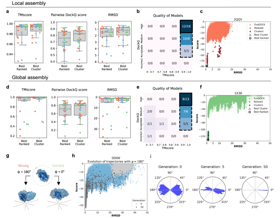 针对AlphaFold-Multimer(AFM)在预测全部界面时的局限性(例如立方系统需三种界面而AFM仅能预测其中一种),研究团队提出了局部补全策略:保留AFM已预测的正确界面,利用EvoDOCK搜索其余界面的最优排布方式。同时,为应对可能的180°翻转对称性,引入双取向采样方法,同步运行两种初始取向的模拟,最终依据能量高低选择最优方向。