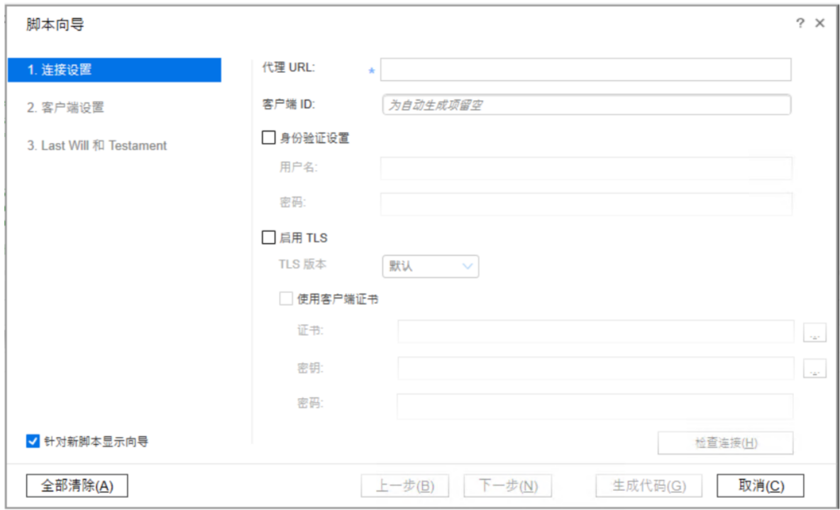 新建 MQTT 脚本时,将自动显示脚本向导 (默认设置)。也可以通过单击 VuGen 工具栏上的“设计脚本”来打开它。(在编辑器中打开 MQTT 脚本时,可使用“设计脚本”按钮。)