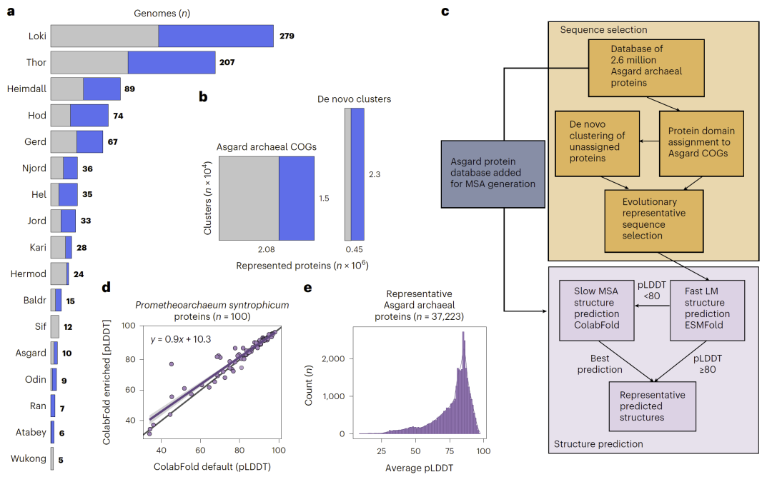 研究人员首先构建了一个包含 936个阿斯加德古菌基因组的数据集,并从中收集了约 260万条蛋白序列。这些蛋白序列通过同源聚类与从头聚类方法被组织为约 3.7万个蛋白簇,随后为每个簇选择一个代表序列用于结构预测。
