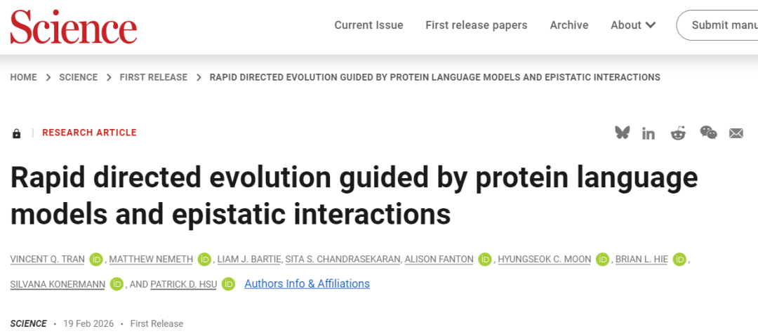 针对上述问题,Arc Institute研究人员于2026年2月19日在《Science》上发表文章,题为“Rapid directed evolution guided by protein language models and epistatic interactions”,其中斯坦福大学的生物化学教授Silvana Konermann、加州大学伯克利分校的生物工程教授Patrick D. Hsu为共同通讯作者。