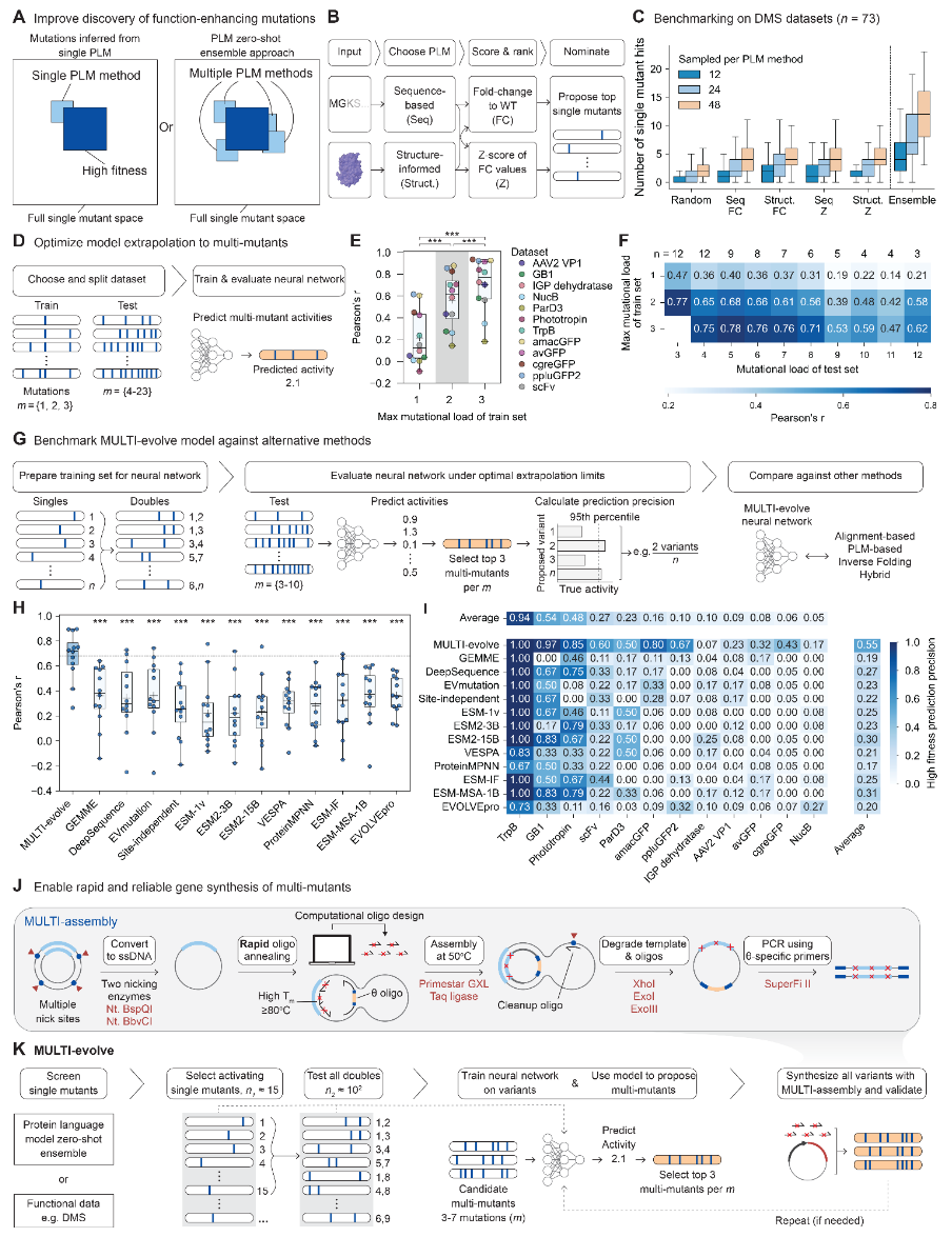 本文提出了一个机器学习引导的框架MULTI-evolve,它通过将进化性PLM先验知识与上位效应建模相结合以获取协同的高阶组合,从而克服了蛋白质工程中巨大搜索空间的挑战。在三种不同的蛋白质APEX、Cas13d和抗CD122抗体上,改造出了性能提升2倍到256倍的变体,展示了广泛的适用性和多目标优化能力。无论初始突变是通过PLM计算识别,还是通过功能筛选实验识别,其预测多突变体活性的能力都是稳健的。通过MULTI-assembly实现了一个端到端的平台,该平台对复杂多突变体实现了40%-70%的合成效率,避免了主观的诱变寡核苷酸设计,并消除了商业DNA合成的瓶颈。最后,开发了一个MULTI-evolve设计工具,用于训练模型、预测多突变体以及设计用于克隆的MULTI-assembly寡核苷酸。总之,该工作建立了一个用户友好的框架,可以针对任何目标蛋白质快速设计复杂的多突变体。