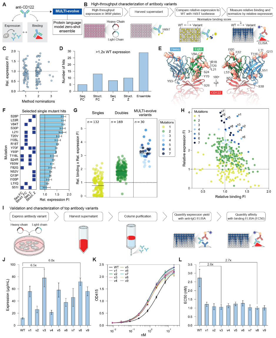 为了展示MULTI-evolve在多目标优化中的适用性,作者选择了HuABC2,一种靶向CD122的抗体,该抗体与包括白癜风、乳糜泻和嗜酸性食管炎在内的自身免疫疾病相关(图5A)。图5结果突显了MULTI-evolve的关键优势:它能够学习功能增强型突变和特性特异性的上位效应架构,从而预测能跨竞争目标进行优化的多突变体。MULTI-evolve可以进一步将低纳摩尔结合剂的结合亲和力从2.7 nM提高到1.0 nM,同时提高表达产量。MULTI-evolve的模块化框架可以轻松扩展到任何可测量的蛋白质特性。通过整合针对血清半衰期、免疫原性或溶解度等额外参数的测定方法,相同的上位效应学习方法可以同时在更多维度上进行优化。该框架的数据高效训练特性使得并行表征多个读出的变体变得切实可行,从而能够从单次实验活动中实现全面的多参数优化。在此,同时改进了抗CD122抗体的表达量和结合亲和力,展示了MULTI-evolve在治疗性蛋白质开发中的能力,因为在此类开发中成功需要平衡可制造性、功效、安全性和药代动力学特性。