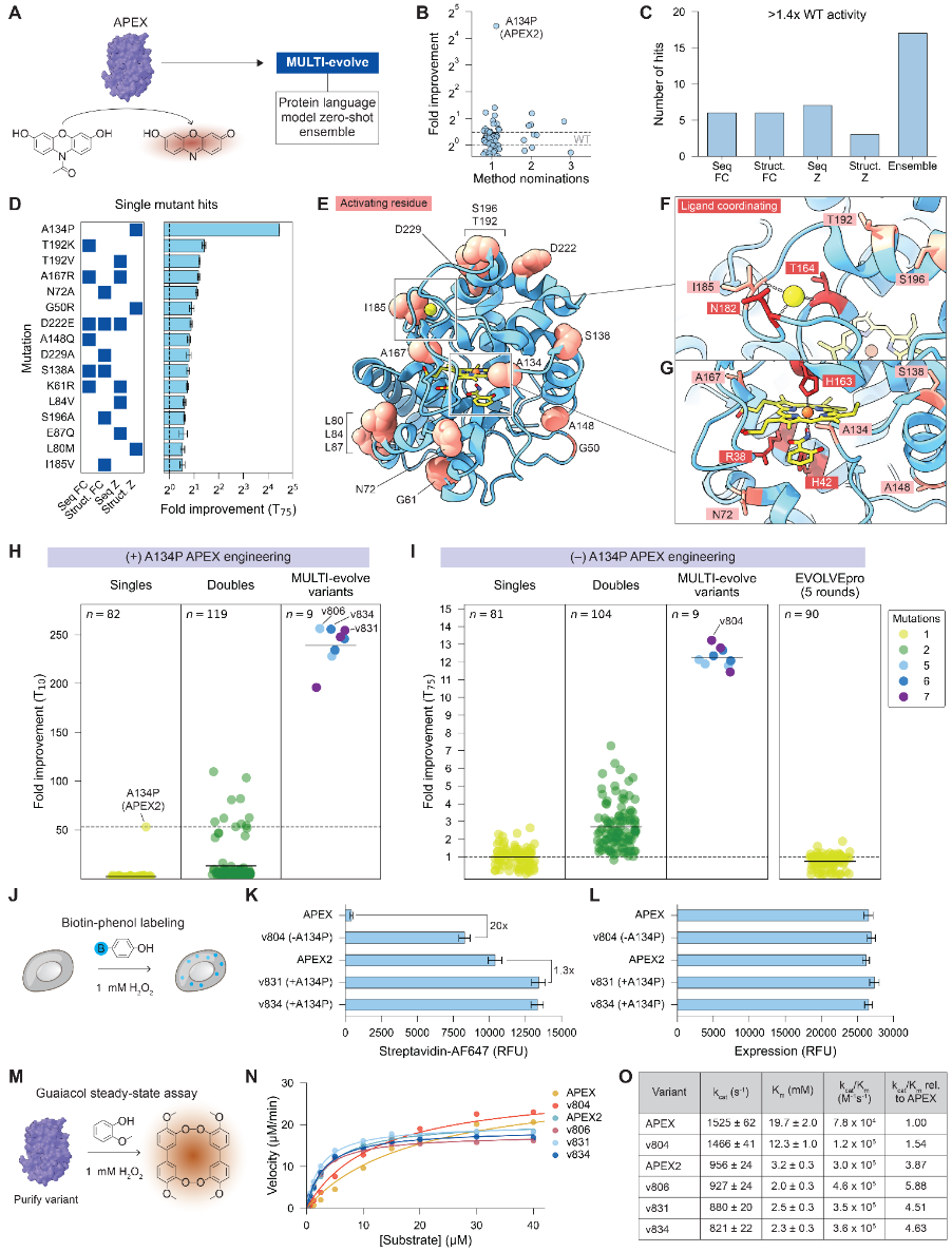 APEX具有快速、高动态范围的读出特性,并且存在已知变体可供比较,特别是APEX2。使用PLM零样本集成方法,提名并实验评估了跨越62个位置的82个突变。通过集成方法,在APEX中识别出16个功能增强型突变(图3B)。通过整合具有互补进化偏差的方法,该集成捕获了任何单一方法都会错过的有益突变,并增加了总命中数,命中定义为活性超过野生型1.4倍以上的突变(图3C)。除A134P突变外,共同识别出15个先前未描述的突变,这些突变使APEX活性提高了1.4至2.7倍,且这些突变是通过一种或多种PLM方法发现的(图3D)。大多数突变的表面定位表明它们的影响可能通过改善蛋白质稳定性来介导(图3E)。除A134P外,唯一靠近活性位点的突变是I185V。I185配位活性位点中的钠离子,推断缬氨酸替换可能降低局部疏水性以改善配位(图3F,G)。总体而言,在APEX上的结果验证了PLM零样本集成方法识别功能增强型突变(如超增强的A134P突变)的能力,为MULTI-evolve构建更高阶组合提供了丰富的突变集合。