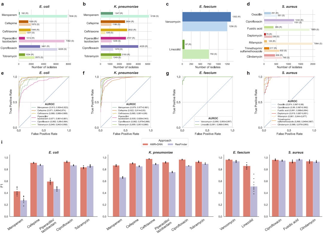 为了评估模型的通用性,研究人员进一步在多个重要病原体的数据集中测试AMR-GNN,包括大肠杆菌、肺炎克雷伯菌、金黄色葡萄球菌和粪肠球菌。