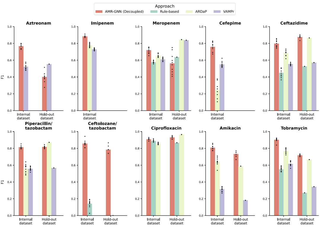 图3|AMR-GNN与规则驱动方法及现有公开AMR表型预测模型的F1-score性能比较。