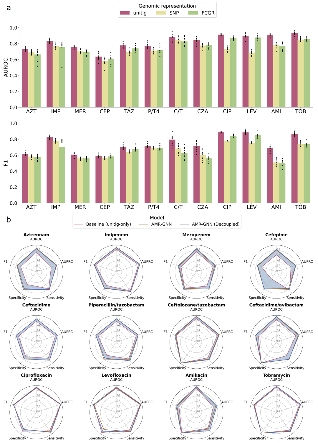 研究人员以铜绿假单胞菌作为示例进行验证,该病原体是一种具有复杂耐药机制的重要临床革兰阴性菌。AMR-GNN被设计为一个概念验证框架,旨在解决当前基于数据驱动机器学习进行AMR表型预测的多个关键问题,包括通过多种基因组表示提升预测性能、减少菌株克隆关系带来的偏差,以及识别关键生物标志物以提高模型可解释性。进一步在一个包含多种革兰阴性和革兰阳性病原体的大型公开数据集上验证表明,该方法在多种病原体和药物组合中均具有良好的泛化能力。