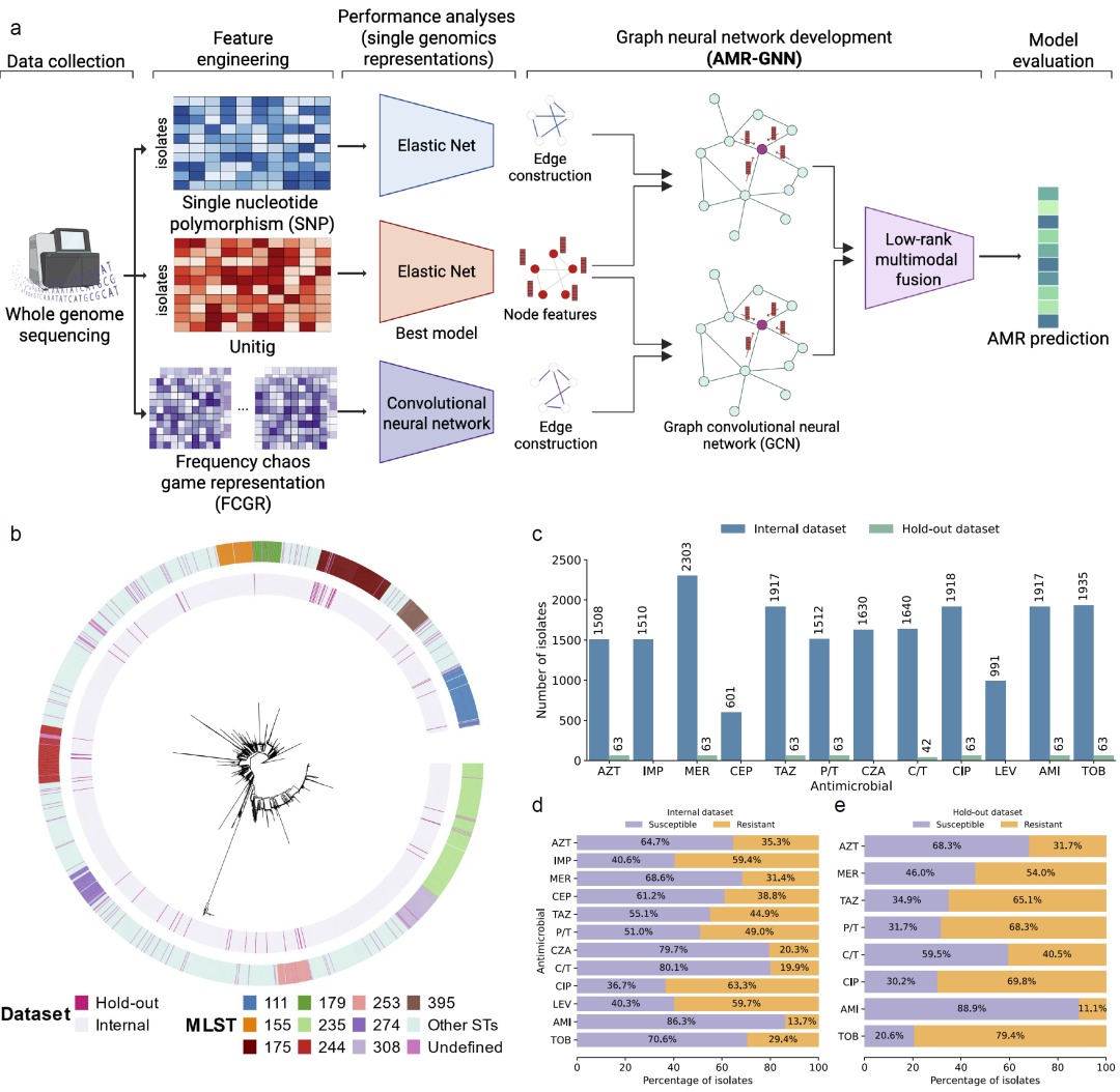 图1|AMR-GNN工作流程及用于训练与测试的铜绿假单胞菌数据集概览。