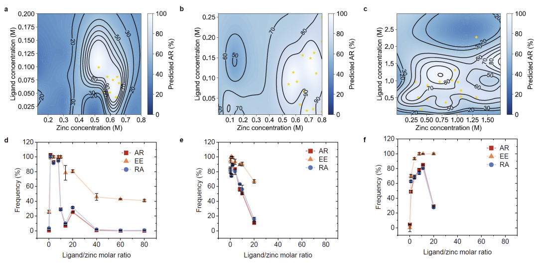 研究人员将反应空间划分为五个变量,包括锌盐类型、配体类型、锌盐浓度、配体浓度以及反应时间。其中前两者为类别变量,其余为连续变量。由于不同变量组合数量巨大,完整实验需要超过一千万次实验,因此必须通过智能算法进行高效筛选。PHBO算法能够在每轮实验中推荐多组实验条件,并通过迭代逐步逼近最佳反应条件。