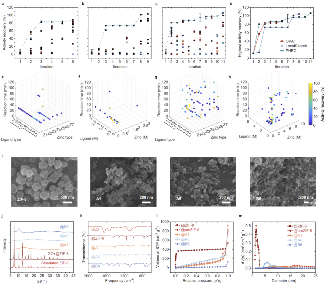 研究人员首先以葡萄糖氧化酶为模型体系,对PHBO算法进行验证,并与传统的逐变量优化方法进行比较。传统方法在47次实验后将活性恢复率从5.2%提高到86.1%,但难以继续优化。相比之下,PHBO在更少实验中快速发现高活性组合,并最终实现超过100%的活性恢复率。