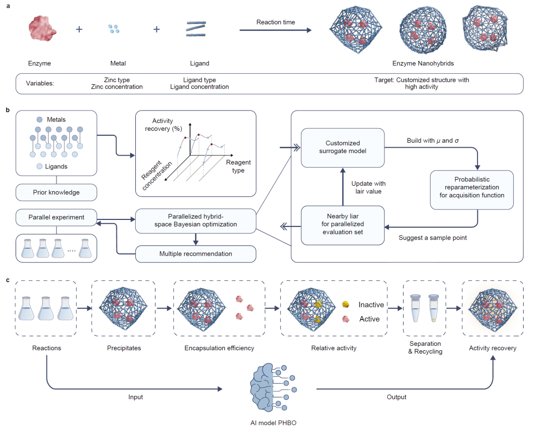 本研究提出了一种结合机器学习与实验优化的酶固定化设计框架,通过并行贝叶斯优化算法高效探索复杂反应空间。该方法能够在有限实验次数下识别出高性能酶纳米杂化材料,并成功应用于多种酶体系。