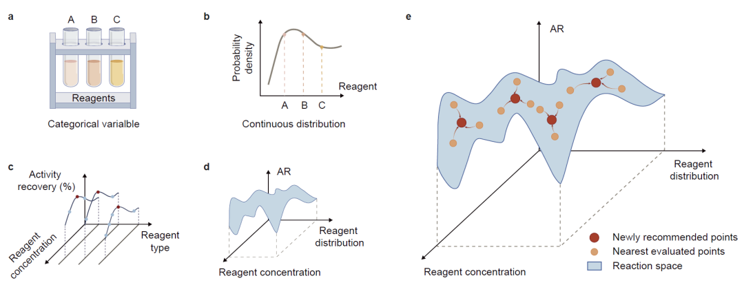 贝叶斯优化是一种高效的全局优化方法,特别适用于实验成本较高的黑箱问题,在材料发现领域已得到广泛应用。然而,在酶固定化体系中仍存在两大挑战:一是反应变量同时包含类别变量与连续变量,形成混合变量空间;二是高通量实验往往需要同时推荐多个实验条件。因此,需要新的算法框架以实现高效探索和并行实验设计。