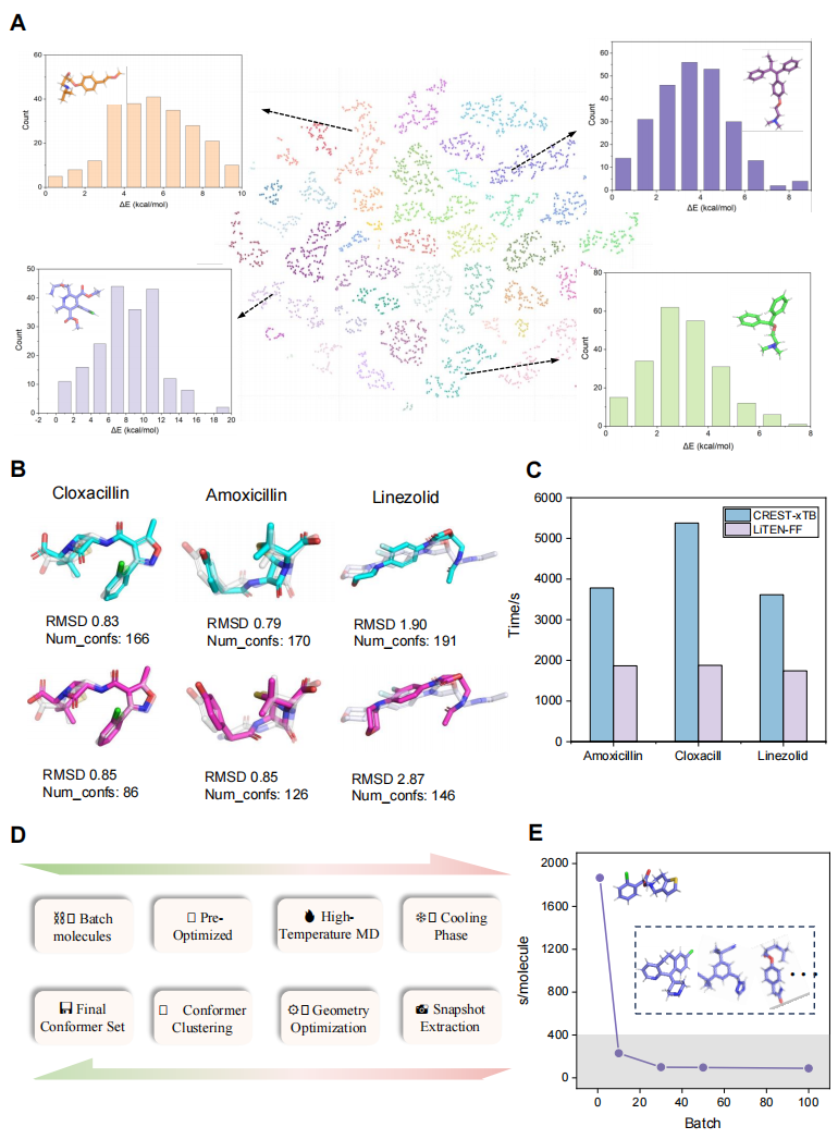 通过部署退火和高温动力学模拟工作流,LiTEN-FF 能够快速探索并生成涵盖宽广能量盆地的多样化分子构象。凭借其独特的计算架构,当处理大量分子的构象搜索任务时,LiTEN-FF 展现出卓越的并行加速能力;随着分子批量的增加,生成速度可实现高达40倍的提升,极大推进了高通量药物筛选工作流的效率(图6)。