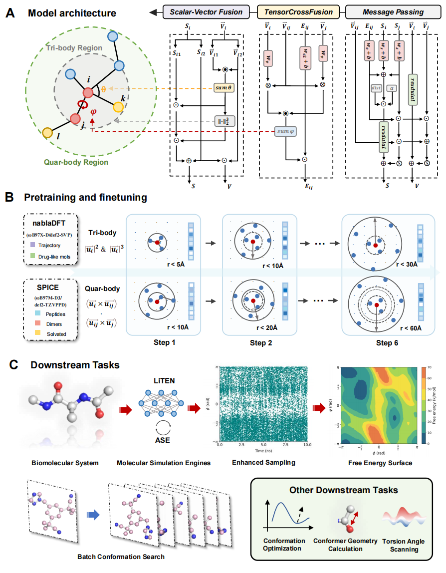 本文介绍一篇来自浙江大学侯廷军教授、谢昌谕教授和王極可博士团队发表的题为“A scalable and quantum-accurate foundation model for biomolecular force fields via linearly tensorized quadrangle attention”的研究论文,共同第一作者为浙江大学博士生苏群,祝凯以及澳门理工大学博士生苟巧林。该研究提出了一种名为LiTEN的等变神经网络及其基础模型LiTEN-FF,旨在解决现有原子级生物分子模拟中难以兼顾量子力学精度与计算可扩展性的困境。LiTEN创新性地构建了线性张量四边形注意力(Tensorized Quadrangle Attention, TQA)机制,以线性复杂度高效建模复杂的三体和四体相互作用。在构象优化、自由能表面构建及大分子体系模拟等任务中,LiTEN-FF展现出最先进的精度与极高的计算效率,为高级生物分子建模与药物设计提供了强大的基础物理计算工具。