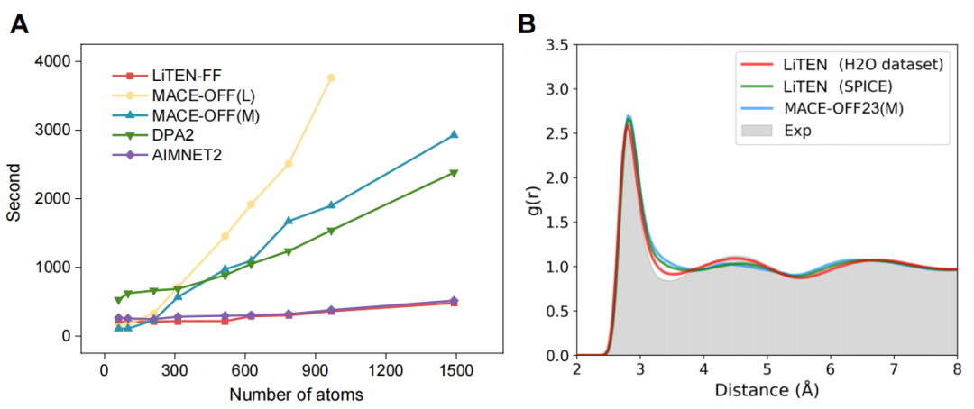 针对包含约1000个原子的大型分子体系,LiTEN-FF展现出卓越的计算可扩展性,其模拟速度比同类领先模型MACE-OFF快10倍以上(图4)。在确保极高推理速度的同时,该模型在周期性水盒子模拟中依然保持了严格的物理保真度,不仅准确复现了径向分布函数(RDF),还精确捕捉到了关键的水合层结构特征。
