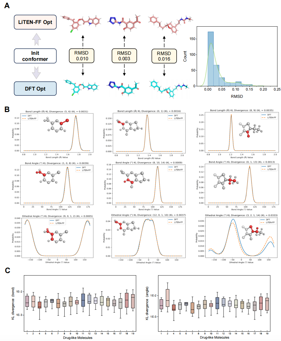 为打破精度与效率之间的壁垒,研究团队开发了 LiTEN 框架(图1)。其核心创新是张量四元注意力(TQA)机制。该机制摒弃了传统的显式高阶张量乘积和球谐函数展开,转而通过向量间的点乘和叉乘重新参数化高阶张量结构,紧凑地编码相互作用并保持等变性。这一设计大幅降低了计算图复杂度,成功突破了Clebsch–Gordan系数计算带来的性能瓶颈,以线性复杂度高效捕获复杂的分子空间扭转及多体耦合关系。在此架构基础上,研究团队采用两阶段层次化训练策略构建了 LiTEN-FF 基础模型:首先在包含1600万个类药物分子构象的 nablaDFT 大规模数据集上进行预训练,以全面捕捉药物样分子的电子结构特征;随后在精度更高、包含200万个生物有机分子的 SPICE 数据集上进行微调。这种训练策略使 LiTEN-FF 具备了跨复杂化学空间与溶剂化环境的强大泛化能力。